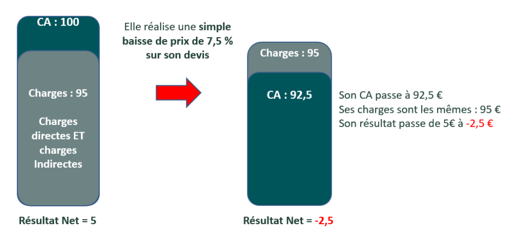 Maintenant, prenons le cas d’une entreprise qui a un taux de résultat de 5% et qui réalise une simple baisse de prix sur son devis de 7,5%
